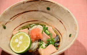 自家製カラスミ、明太子、このわた、焼さつま揚げ、めかぶ、空豆塩煮、イクラ沖漬け、もずく酢、お漬物